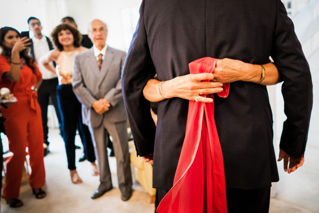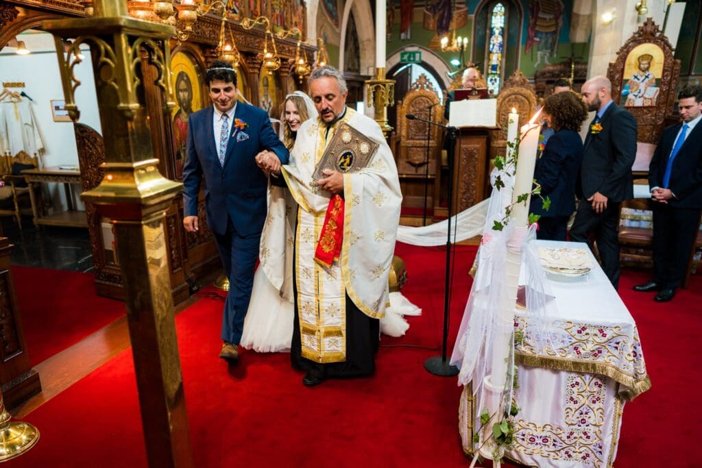 The morning started at Angelo’s parents house. Angelo’s sister took on the role of Koumbaro (similar to a best man) and she shaved him and finished buttoning up his shirt while a violinist played. Then various members of Angelo’s family perform the Stolisma, where a red scarf is tied around the Groom’s waist to symbolise fertility and then the Kapnistiri smoke blessing. Traditional Greek food and a good few shots of vodka were passed around as everyone relaxed.