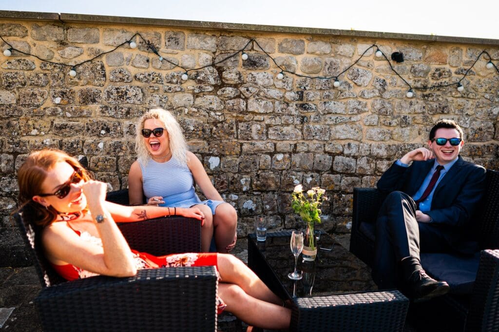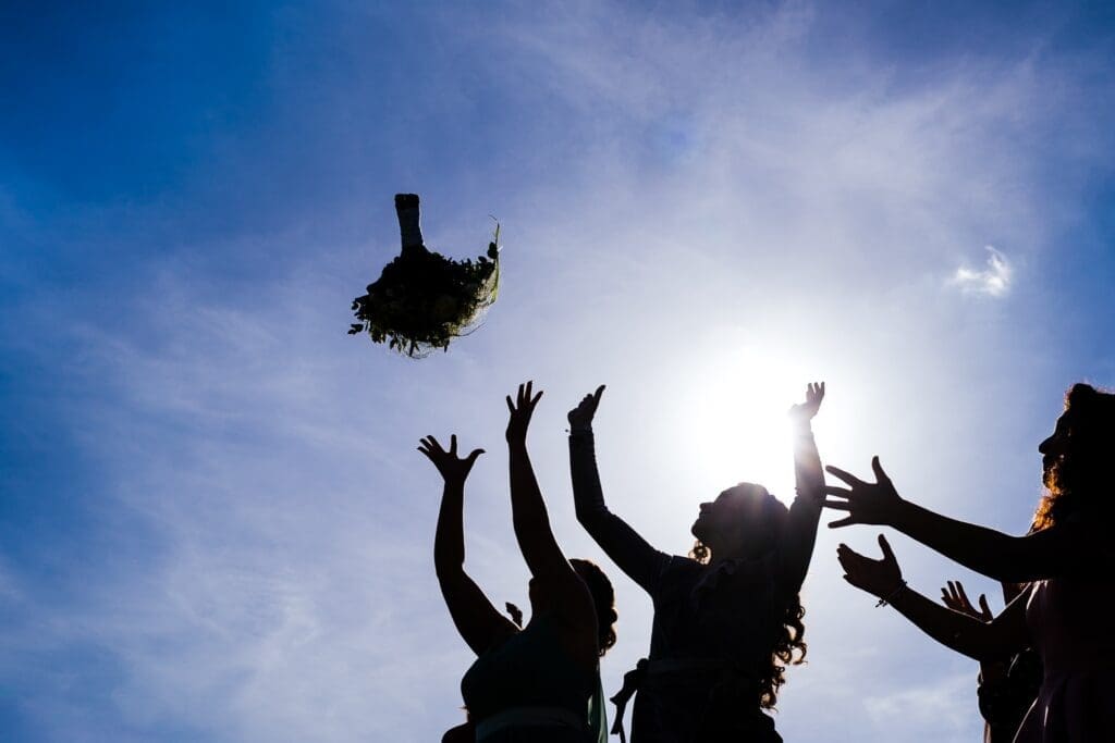 After the ceremony drinks and canapes were served in the garden under blistering late summer sunshine while Rose string quartet entertained people with their wide repertoire of modern pop songs. After a few quick group shots Gemma did a bouquet toss, only the third time I’d see a bride do one in 2018, it seems to really have gone out of fashion, but it’s often a good moment to capture so I was happy to see it included this time. Guests took this time to read through the Dapper & Bride magazine the couple had had made for the day, which provided information to guests about the happy couple the wedding day. I’ve seen these types of personalised wedding magazines before but the Dapper & Bride one is probably the best quality one, particularity with all the images included that I took of Gemma & Harry on their pre-wedding shoot! They actually made their magazine a feature on their website and you can see it here, along with photos I took of guests reading it on the day.