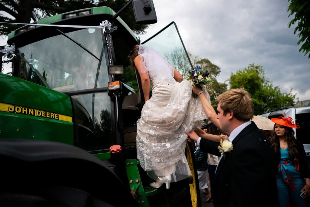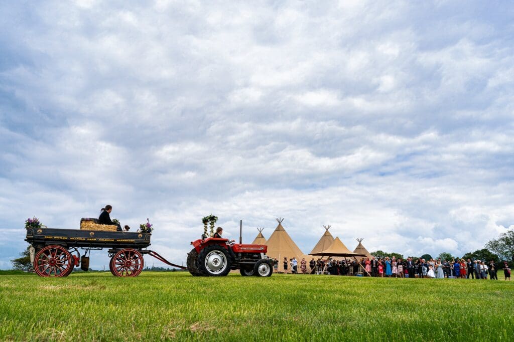 The ceremony took place at the nearby St Peter’s Church in Inkberrow before everyone headed over to the tipi set up in one the their fields. The newlyweds arrived for the reception on a 100 year old trailer towed by a 60 year old tractor which is definitely one of the most spectacular (and slowest!) entrances I’ve seen a couple make.