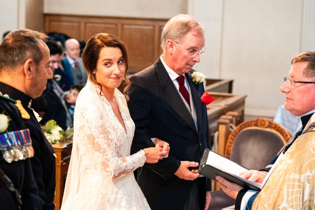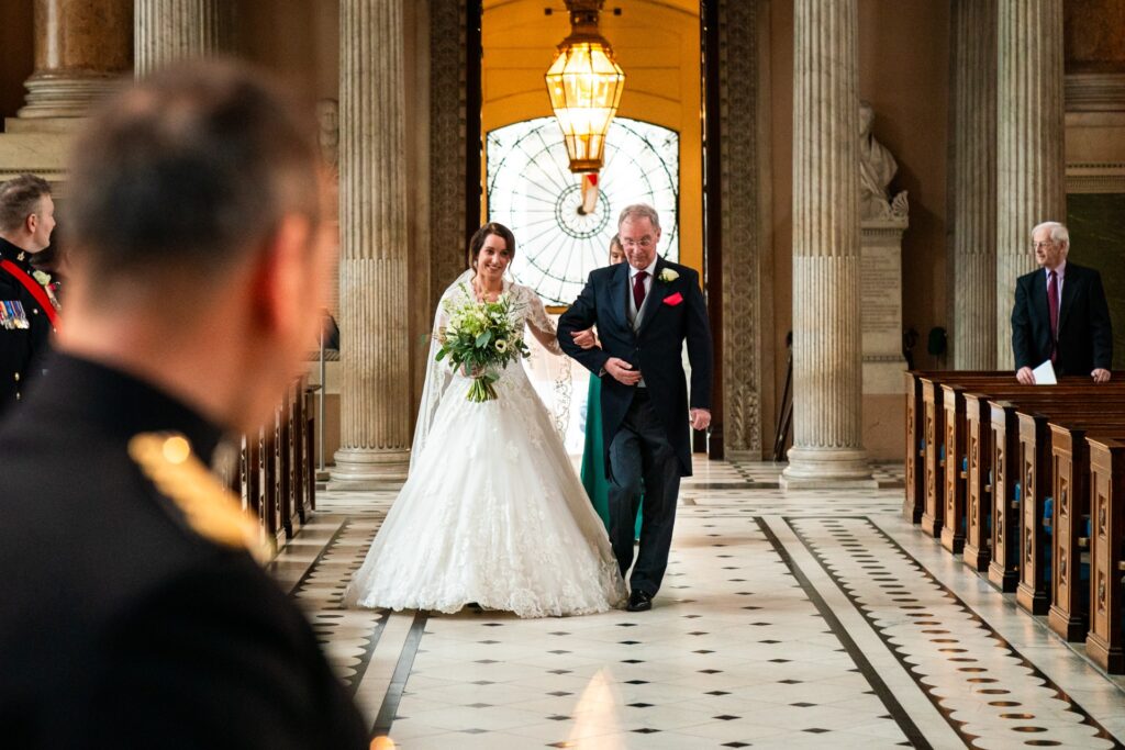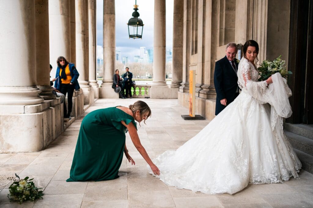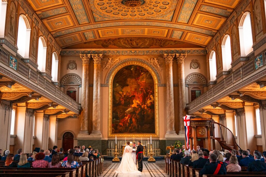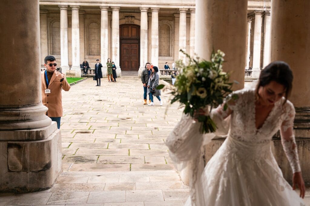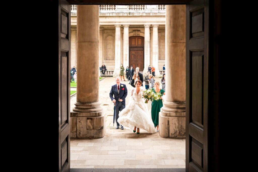 Over at the hotel things were quiet and calm. Ellie had opted not to have a big bridal party to keep things simple and meant her morning was nice and relaxed as she chatted with her mother and one friend during her hair and make-up. I left ahead of the bride with her mother and a few family members in a taxi to capture arrivals at the Royal Naval College. The choice of ceremony location was a very personal one for Ellie & Si as Si’s dad had been the chaplain of the college’s chapel in the 1980’s and Si himself had entered the military. Guests arrived to the sound of a military piper, which attracted members of the public and tourists who took in the sight of gathering uniforms and well-dressed guests outside of the chapel.
