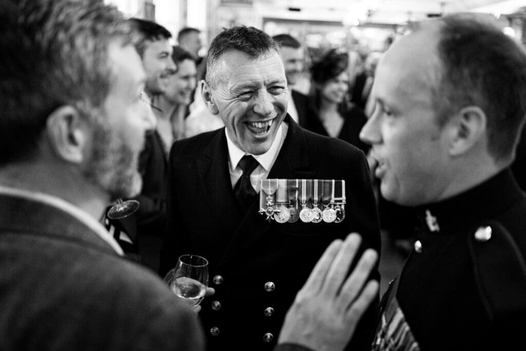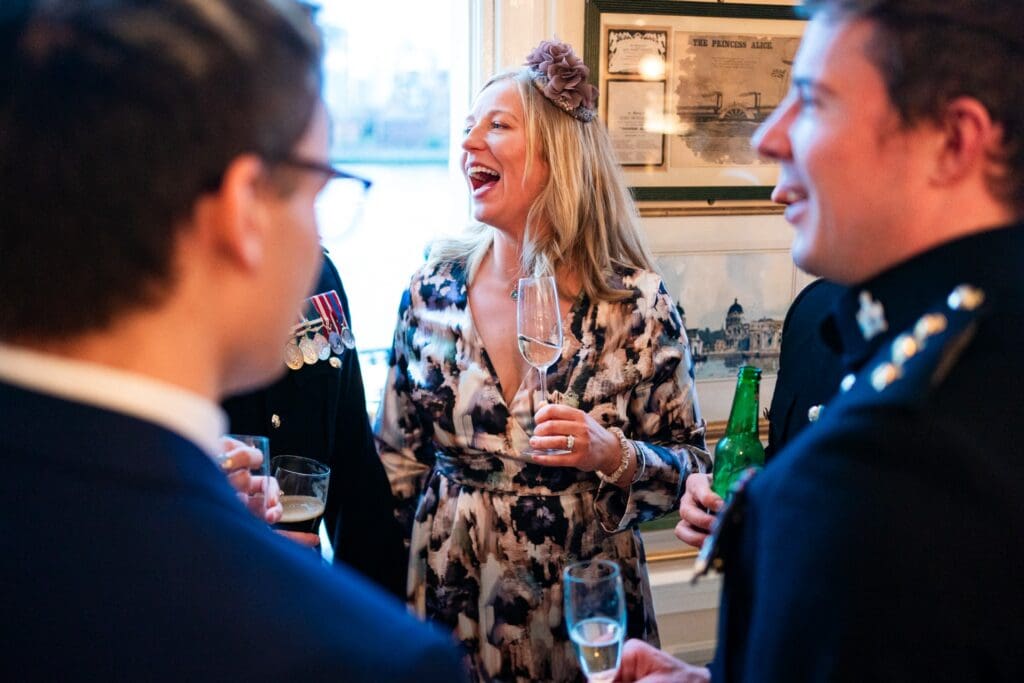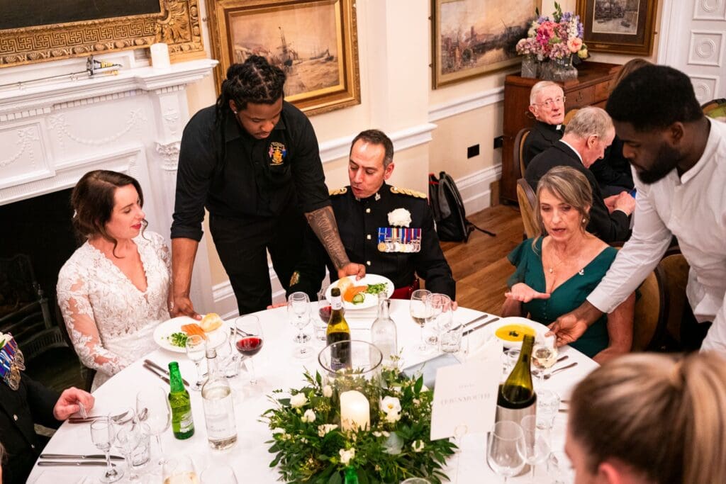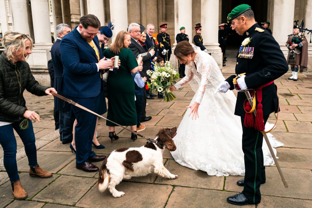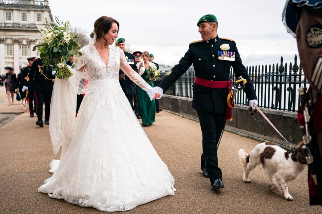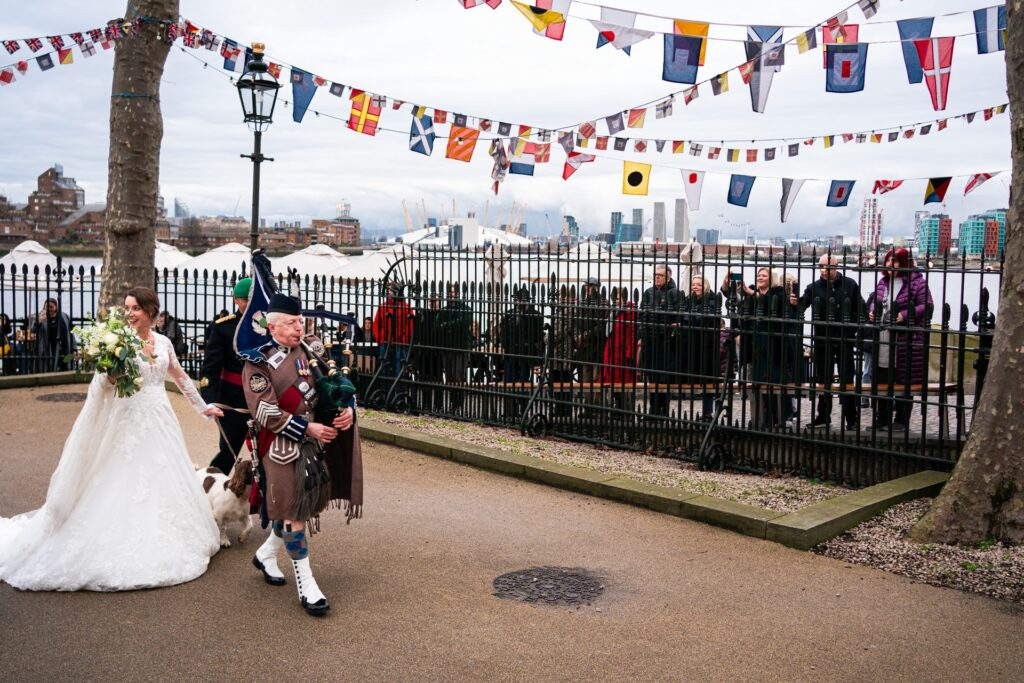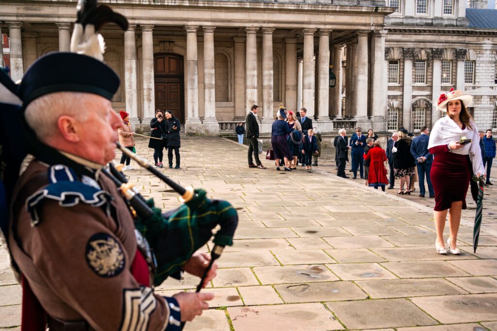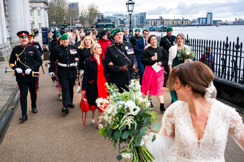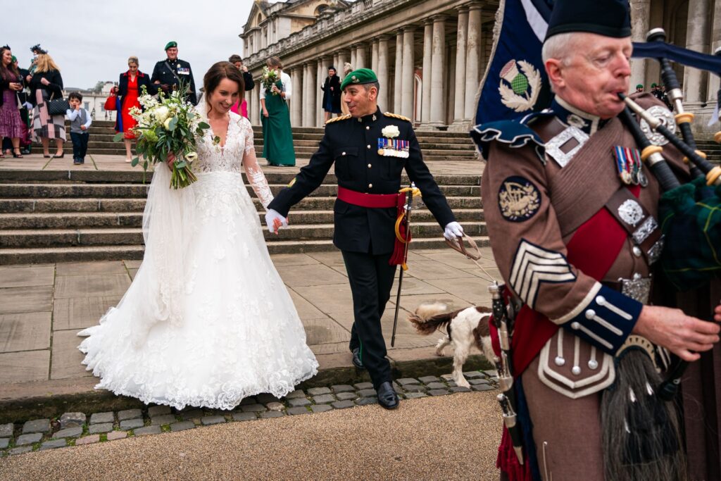 After the ceremony the newlyweds walked out under a traditional military honour guard before having a small drinks reception on the grounds of the college for around 15 minutes. We were then led the 5 minute walk over to the Trafalgar Tavern by the piper to continue the drinking and mingling.
