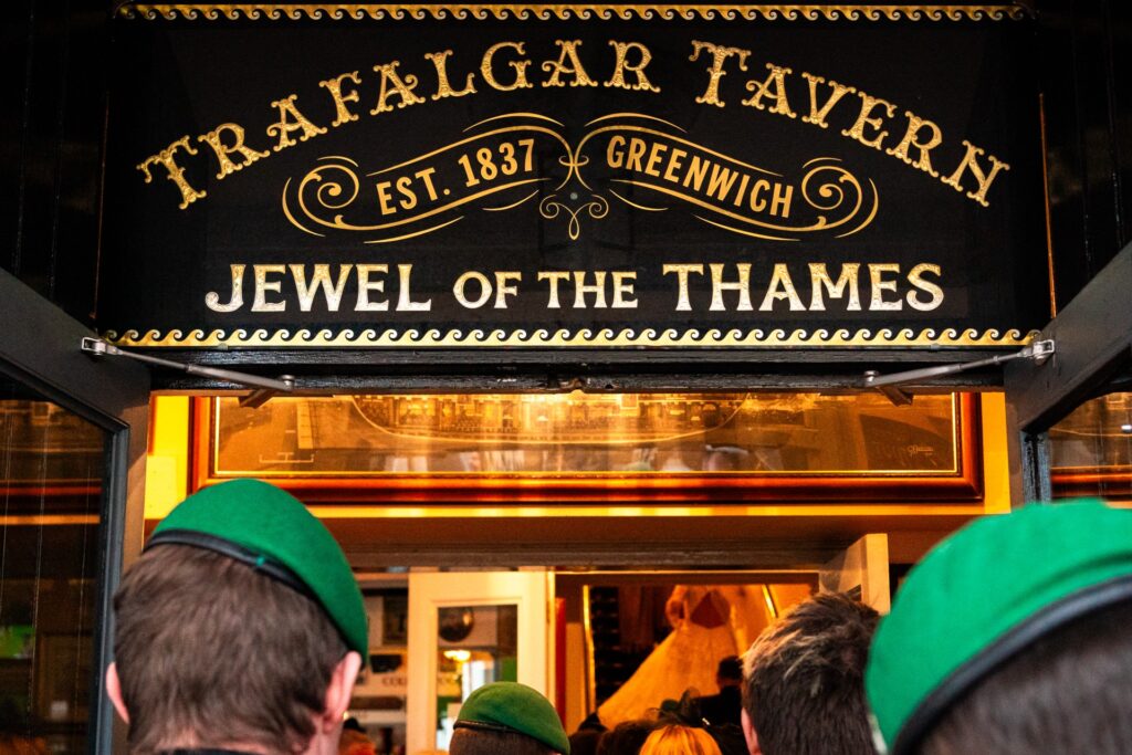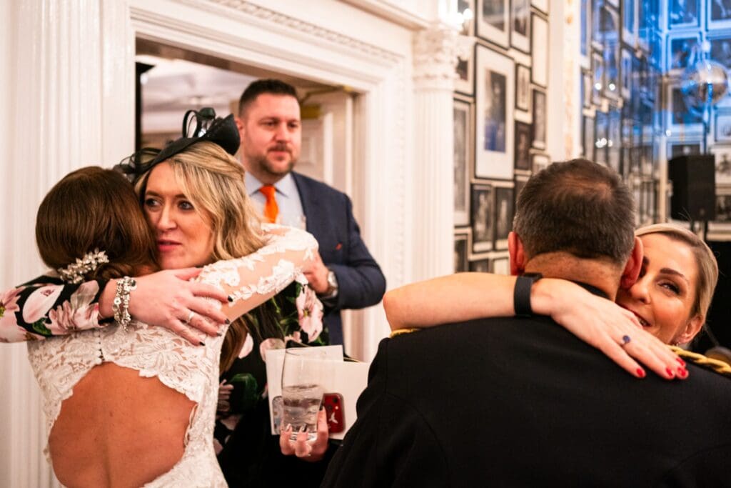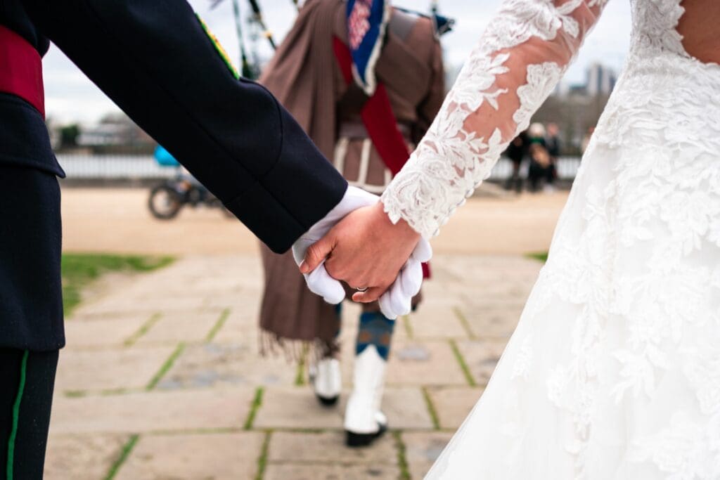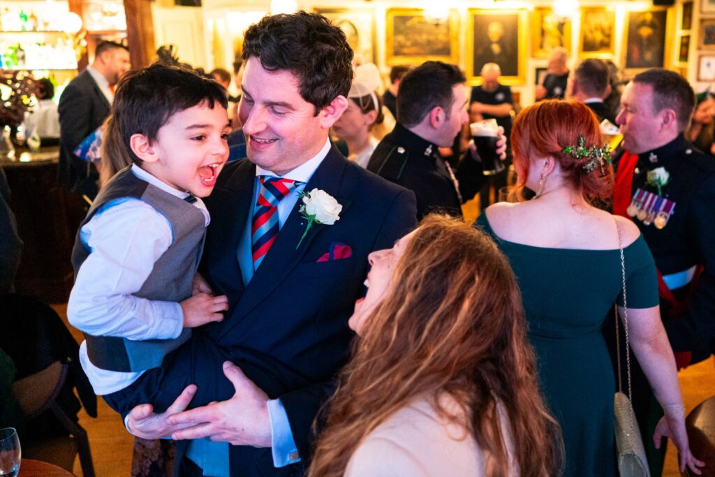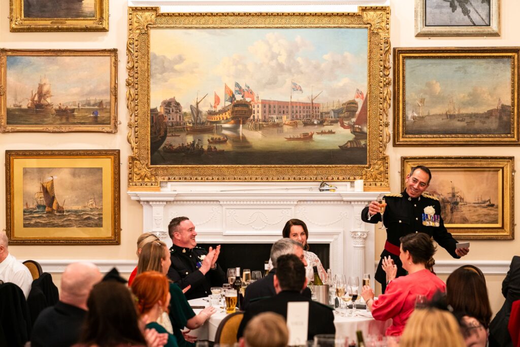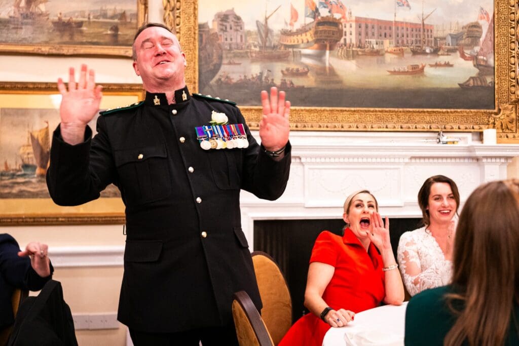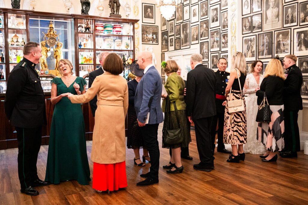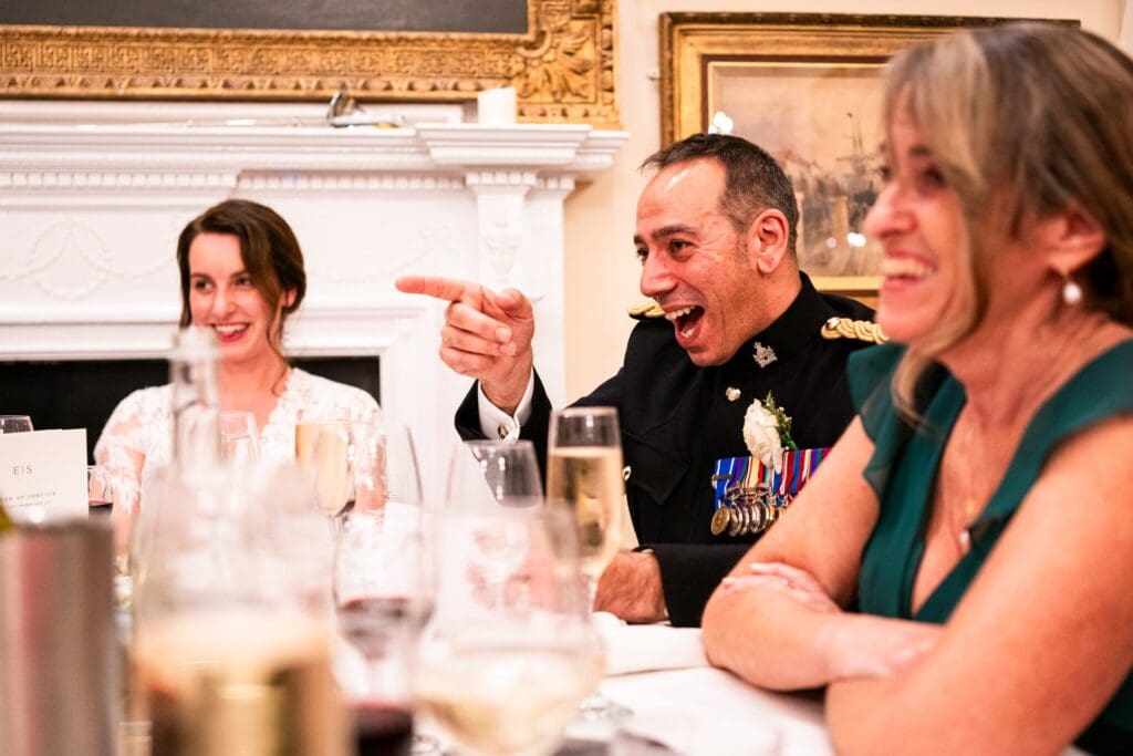 After the ceremony the newlyweds walked out under a traditional military honour guard before having a small drinks reception on the grounds of the college for around 15 minutes. We were then led the 5 minute walk over to the Trafalgar Tavern by the piper to continue the drinking and mingling.
