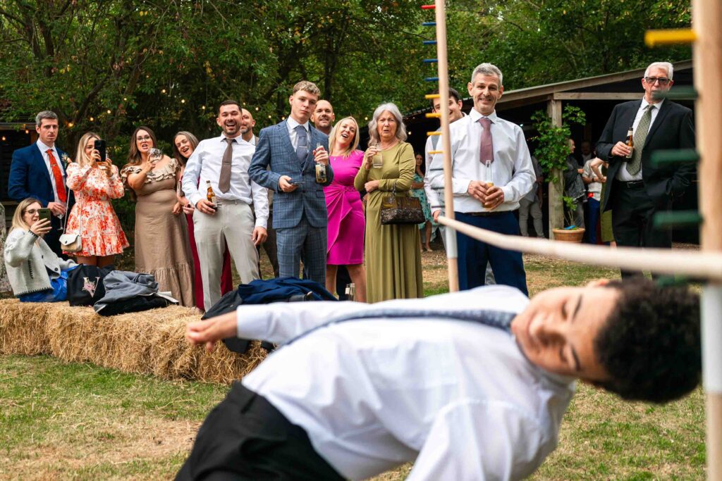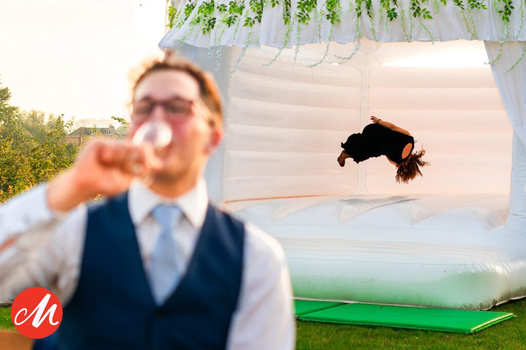 In this frame I waited to hit the shutter when the guest in the foreground sipped their drink at the same time that the guest on the bouncy castle was in the air. This puts two different and sperate action points together in one moment. Different moments in layers help place the viewer in the scene and keep your eye interest in the frame as it has more than one subject to look at.