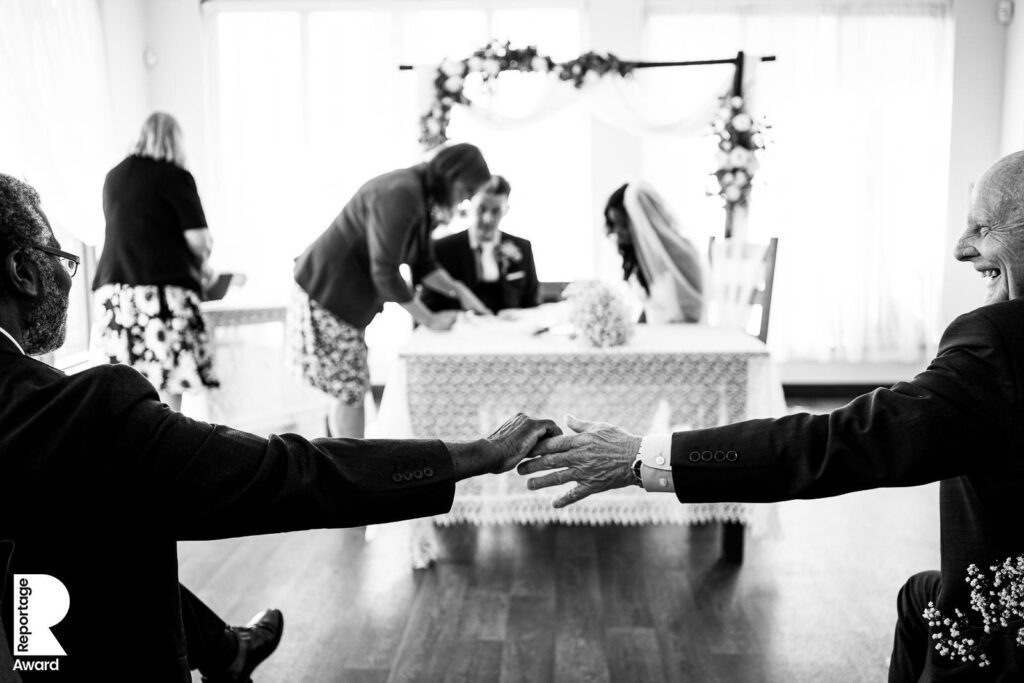 The bride & groom each independently play with their new rings while waiting to be announced into the room for their wedding breakfast. Documentary photographers are constantly looking for these small but meaningful and insightful moments which aren’t considered classic wedding day imagery. Jos & James have this framed on their wall at home. They had no idea they were both doing this at the same time and love that they were both doing this at the same time without realising. “This is in our hallway and I look at it everyday” Jos told me when it won a Photographer’s Keeping It Real award.