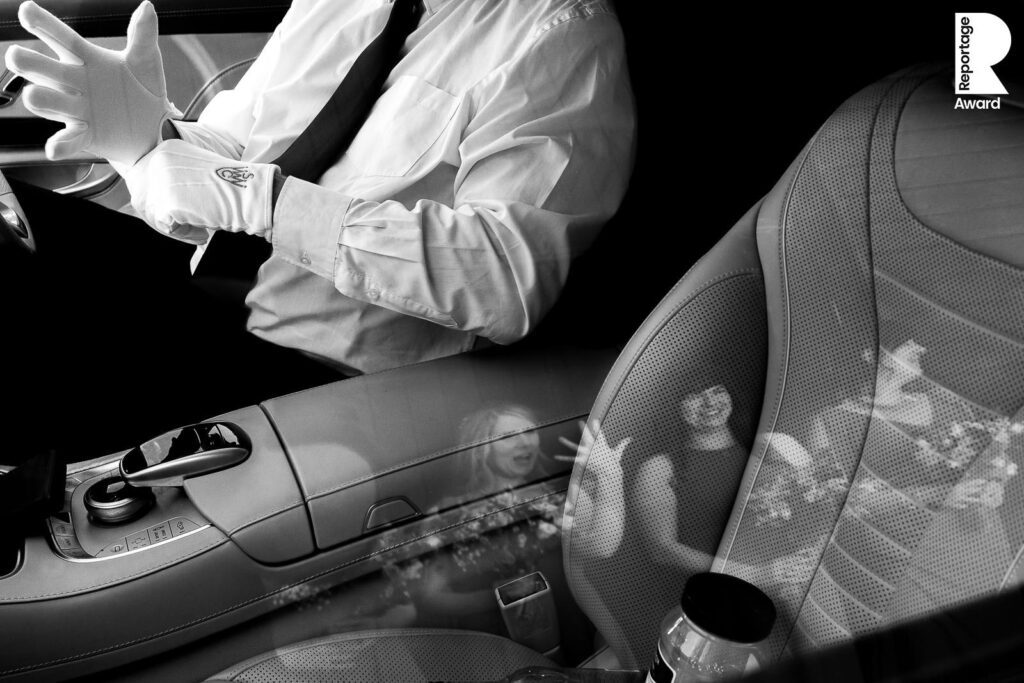 A chauffeur adjusts white gloves while a waiting bridesmaids spots the gloves going on and gestures to the bride in the rear of the car. Documentary photography looks for these kind of layered compositions while candid photography uses simpler frames. I use a combination of candid and documentary photos to tell the story of the day, an approach which I call ‘candid storytelling’.